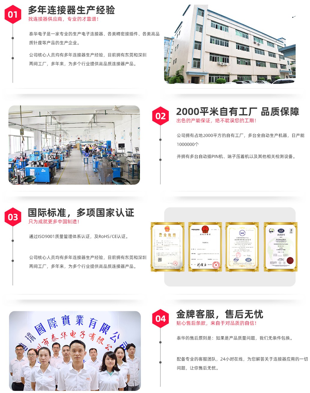 深圳市泰華電子有限公司15年專(zhuān)注連接器,多來(lái)成功為全國(guó)2000家大中小型企業(yè)提供專(zhuān)業(yè)的技術(shù)和服務(wù)。本公司具備先進(jìn)的生產(chǎn)設(shè)備,標(biāo)準(zhǔn)化生產(chǎn)流程接插件日產(chǎn)100萬(wàn)。所有產(chǎn)品通過(guò)ISO9001、ROHS等認(rèn)證,自成立以來(lái)一直秉承品質(zhì)為先,客戶(hù)至上的理念。